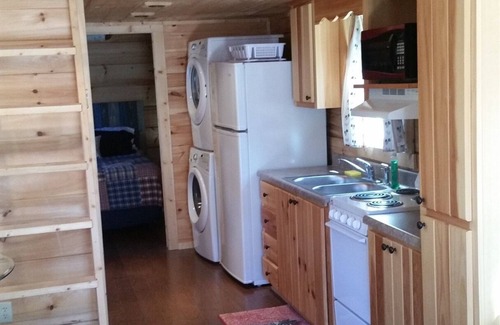The living room is furnished with a couch and recliner, perfect for unwinding after a day of exploring. The fully equipped kitchen is ready for meal preparation, with an electric stove, microwave, and full refrigerator with an ice maker. For added convenience, the cabin also has a full-size washer and dryer.