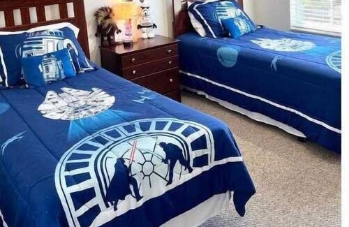 Venturing upstairs, you'll discover three additional cozy bedrooms with TVs, including a delightful Mickey themed room and a thrilling Star Wars themed room, adding an extra touch of magic and adventure to your stay. Another master suite with its own private bathroom completes the upstairs accommodations. Families traveling with little ones will appreciate the provided baby safety gate, umbrella stroller and Pack & Play, ensuring a stress-free stay. Outdoor play equipment is also available for added fun.