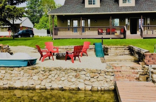 Property includes a large deck over water, dock, fire pit area next to lake, a gas grill, covered deck, fenced yard in back to keep youngsters safe, & (for $25/ night) 2 RV Spots with FULL HOOKUPS (water, sewer, & power).