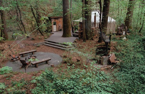 Come and relax! We have an outdoor (and indoor) shower, a claw foot bath tub, fire pit, and large deck to chill on. Surrounded by Ferns, Madrones, Incense Cedars, and Doug Firs, you will never know you are only two miles from town. We have hours of hiking right outside the yurt. Our property connects to the Woodpecker Preserve and the Gracie Trail if you hike up the mountain.