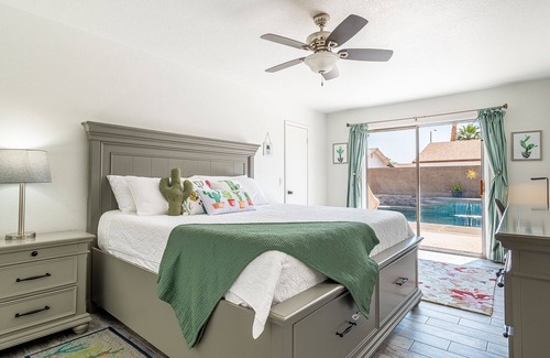 This charming 4-bedroom, 2-bath vacation rental home in Yuma is perfect for your next desert escape. Boasting 2 living areas, as well as a private pool and patio, where you and your loved ones can enjoy afternoon barbecues, The Yuma Sunshine House offers comfortable arrangements for up to 10 guests. Just a short drive to local shopping and eateries. Centrally located in the heart of Yuma, this charming home away from home will serve as the perfect setting for your next desert adventure with your family and closest friends! Bedroom 1: King Bed w/ 40" TV, Desk | Bedroom 2: Queen Bed | Bedroom 3: Queen Bed | Bedroom 4: Twin Bunk Bed | Living Room: Queen Sleeper Sofa OUTDOOR SPACE: Pool (NOT heated), Furnished patio, Gas grill INDOOR LIVING: 65" Roku TVs in both living areas, Fast WiFi KITCHEN: Fully equipped with cooking basics, dishware/flatware, Keurig Duo pod/drip coffee maker GENERAL: Washer/dryer, linens/towels, central AC/heating FAQ: Step-free access, 3 external security cameras, quiet hours (10pm-7am) PARKING: Garage (2 vehicles), free street parking, 4 car max The whole house and garage except for a couple locked cabinets for owner supplies. I live in Yuma and am available if needed. Quiet Centrally Located Neighborhood Near Shopping, Hospital, Attractions and More Distance from Areas of Interest Yuma Palms Mall 4 miles Downtown Historic Yuma 5 miles Walmart Market (Grocery) 2 miles Walmart Supercenter 3 miles Starbucks/Dutch Bros 3 miles Ironwood Golf Course less than 2 miles Desert Hills Golf Course 5 miles Cocopah Casino 8 miles Paradise Casino 6 miles Quechan Casino 11 miles Los Algodones 13 miles Telegraph Pass (hiking) 19 miles MCAS 8 miles YRMC (Hospital) 3 miles Yuma International Airport 6 miles West Wetlands Park/Colorado River 4 miles Territorial Prison Museum 5 miles You need a car in Yuma to get around. Very safe to walk around if you wish. Important- there is NO FENCE around the pool. There are door alarms if you would like to use them. Pool is NOT heated.