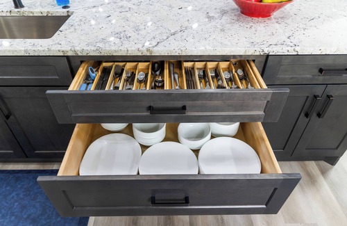 The kitchen is fully stocked for a crowd and designed to seat 20+. Enjoy our coffee/tea station with Keurig coffee and tea maker and electric kettle (also hot chocolate and apple cider available).